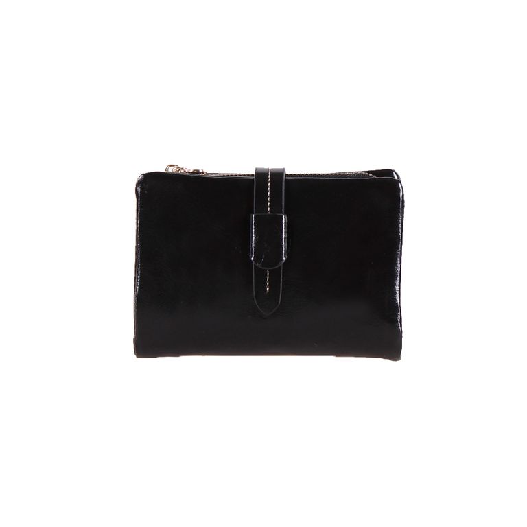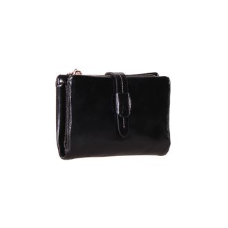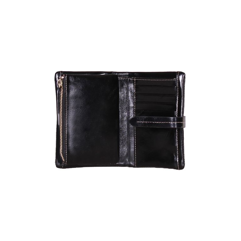 Модель закрывается с помощью перекидного хлястика. Внутри одно отделение на молнии, одно отделение для купюр, одиннадцать карманов для кредитных и пластиковых карт, отделение под монеты на молнии.