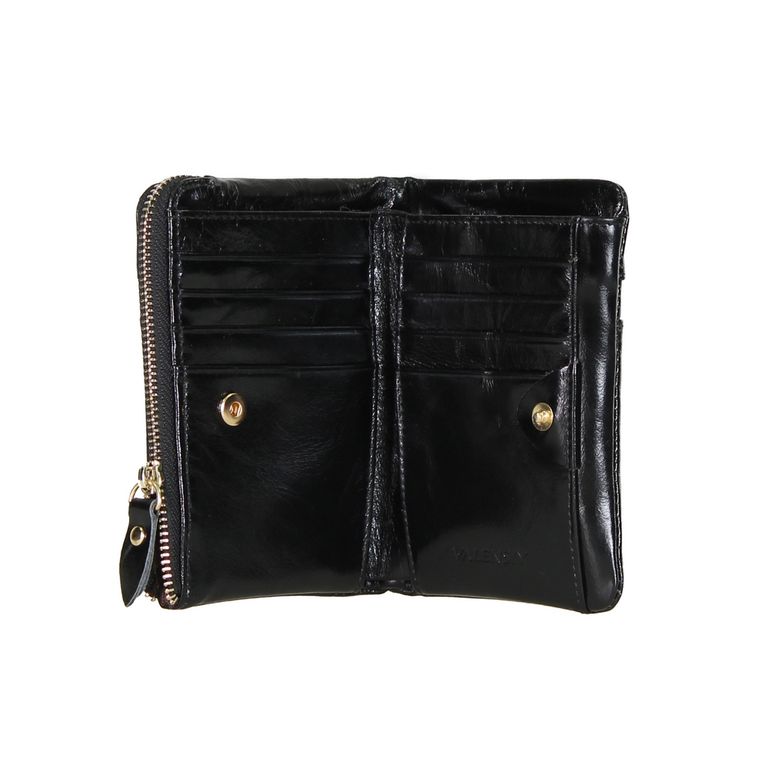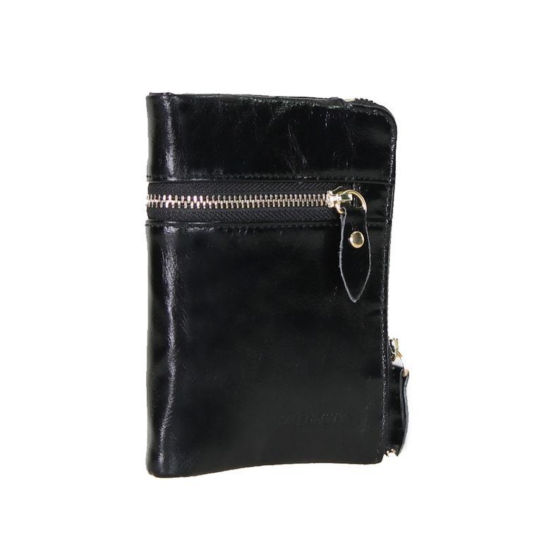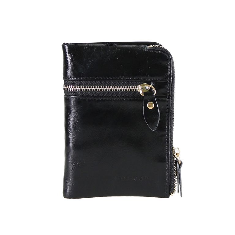 Модель закрывается металлическую молнию. Внутри одно отделение для купюр, десять карманов для кредитных и пластиковых карт, отделение под монеты на молнии. На наружной поверхности дополнительный карман на молнии.