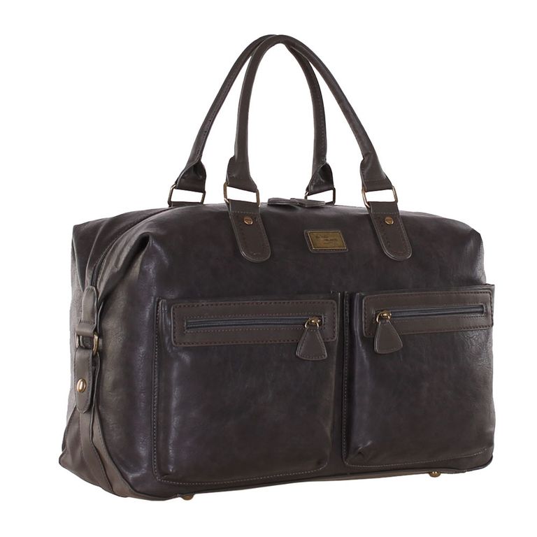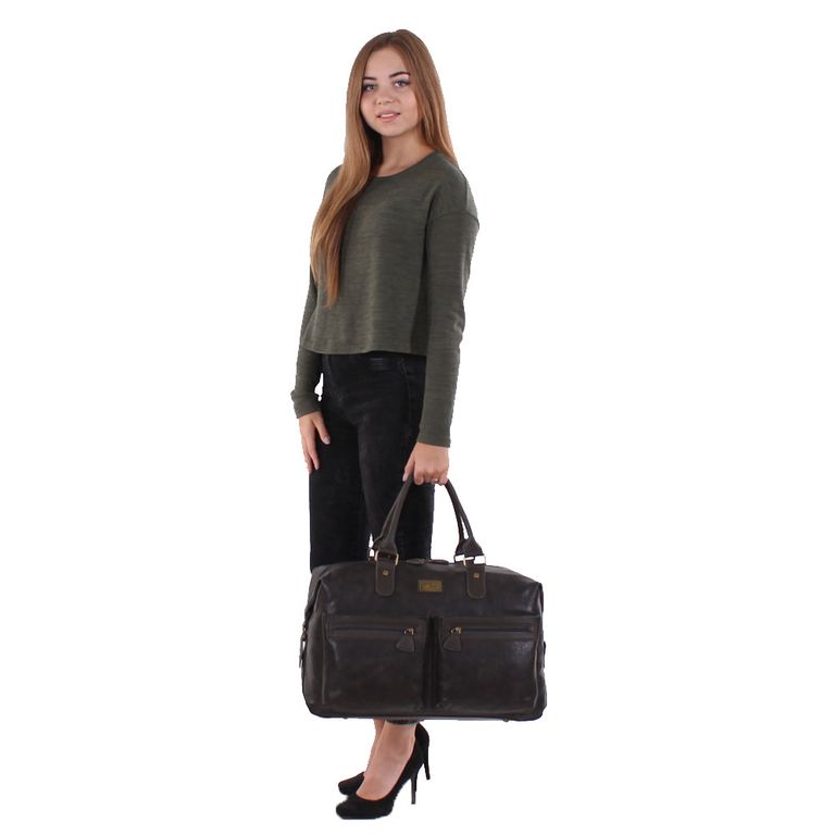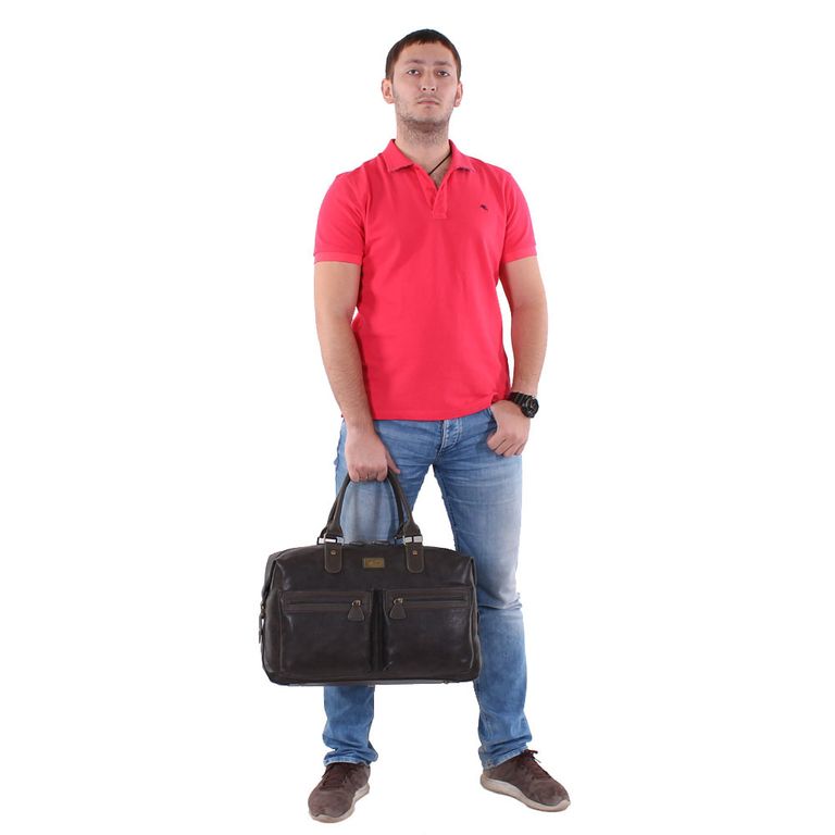 Модель имеет один отдел на молнии, на задней стенке карман на молнии, на передней стенке два кармана на молнии и два открытых кармана. Внутри подкладочный материал с логотипом производителя, на боковых стенках два открытых кармана и карман на молнии. Фурнитура состаренная желтая. Ножки есть. В комплекте плечевой ремень с регулировкой длины.