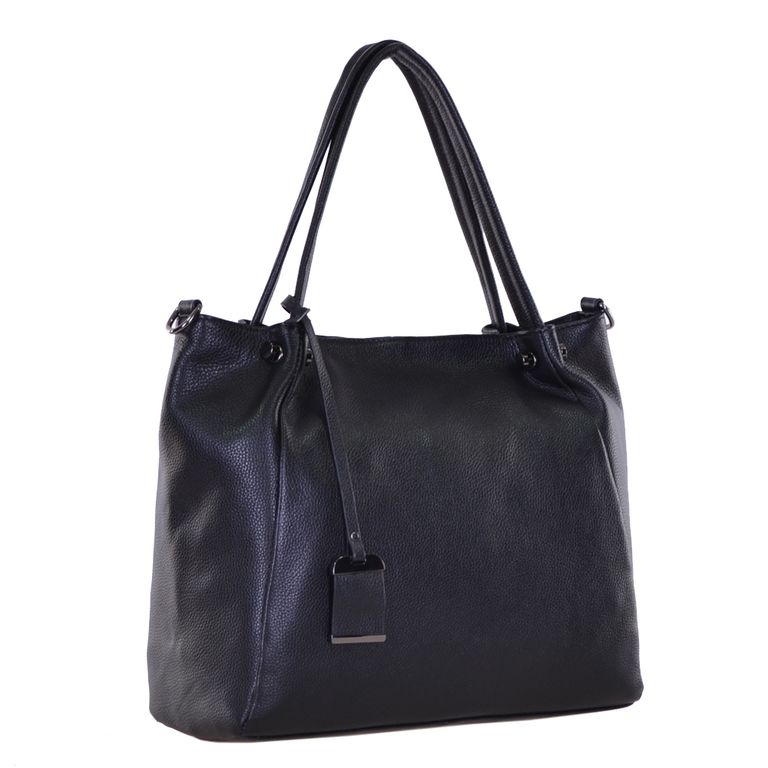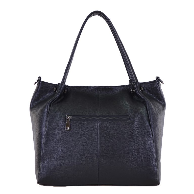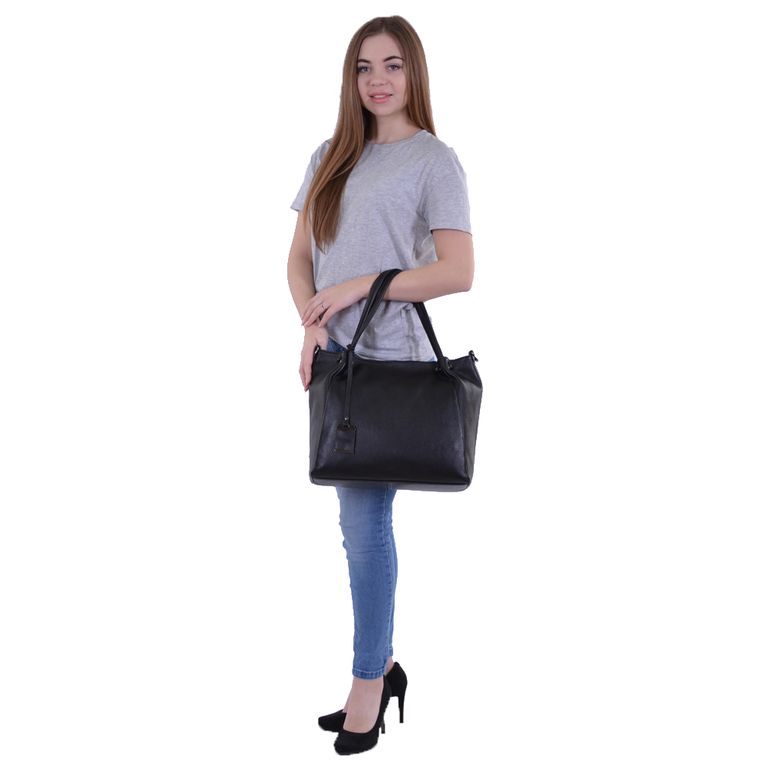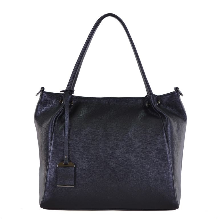 Модель имеет один отдел на молнии и карман на молнии. Внутри подкладочный материал, основное отделение разделено перегородкой с карманом на молнии, на боковых стенках два открытых кармана и карман на молнии. Фурнитура – блестящее серебро. В комплекте плечевой ремень с регулировкой длины.