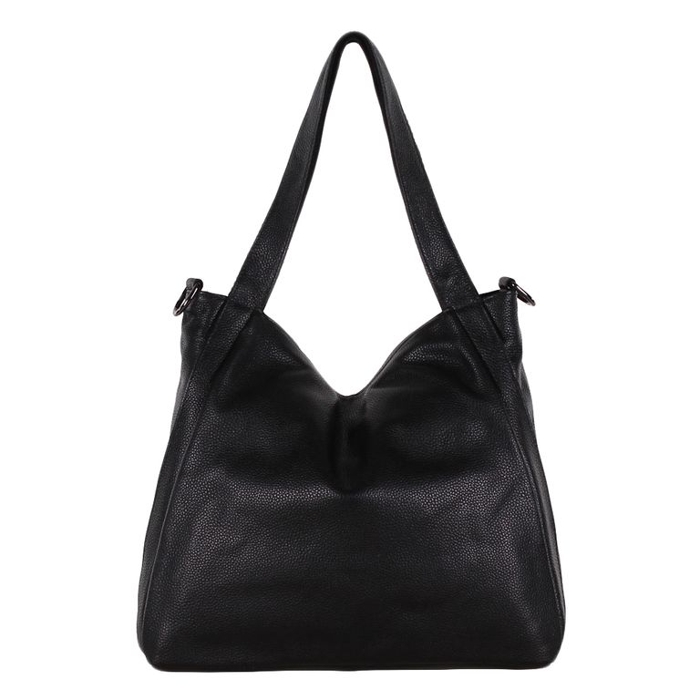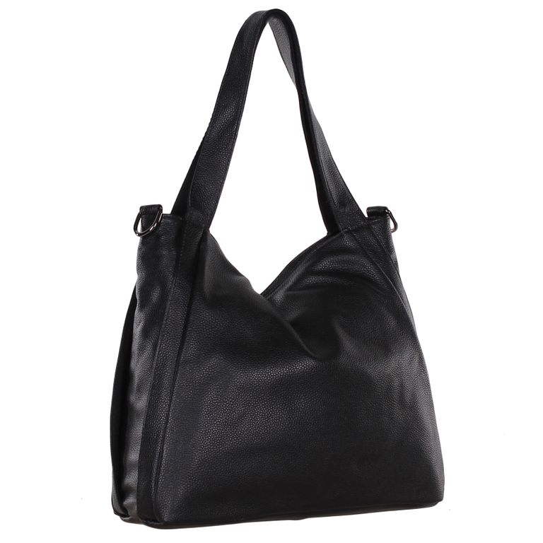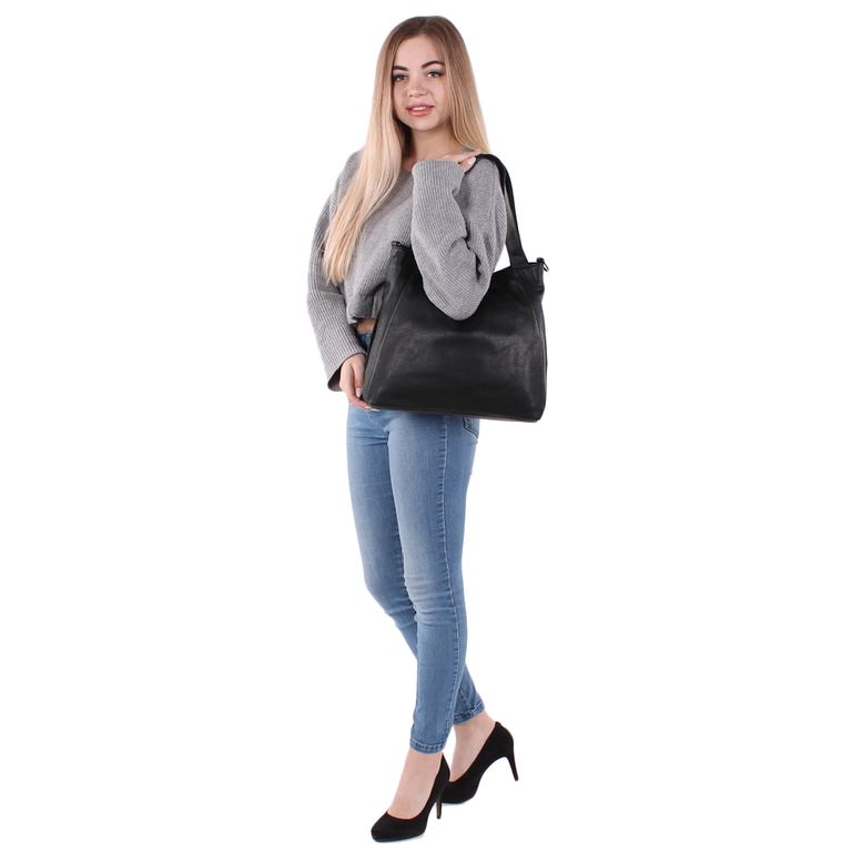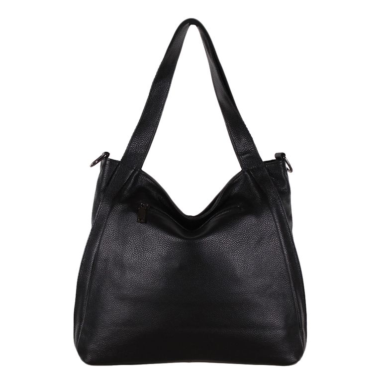 Модель имеет один отдел на молнии и карман на молнии. Внутри подкладочный материал, основное отделение разделено перегородкой с карманом на молнии, на боковых стенках два открытых кармана и карман на молнии. Фурнитура – блестящее серебро. В комплекте плечевой ремень с регулировкой длины.