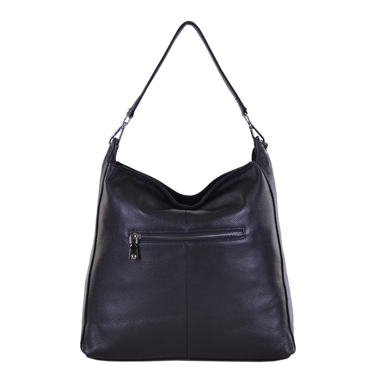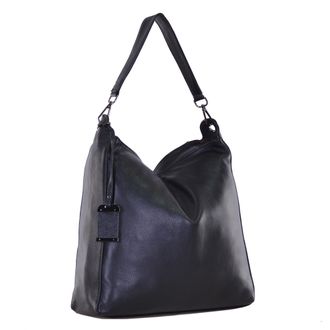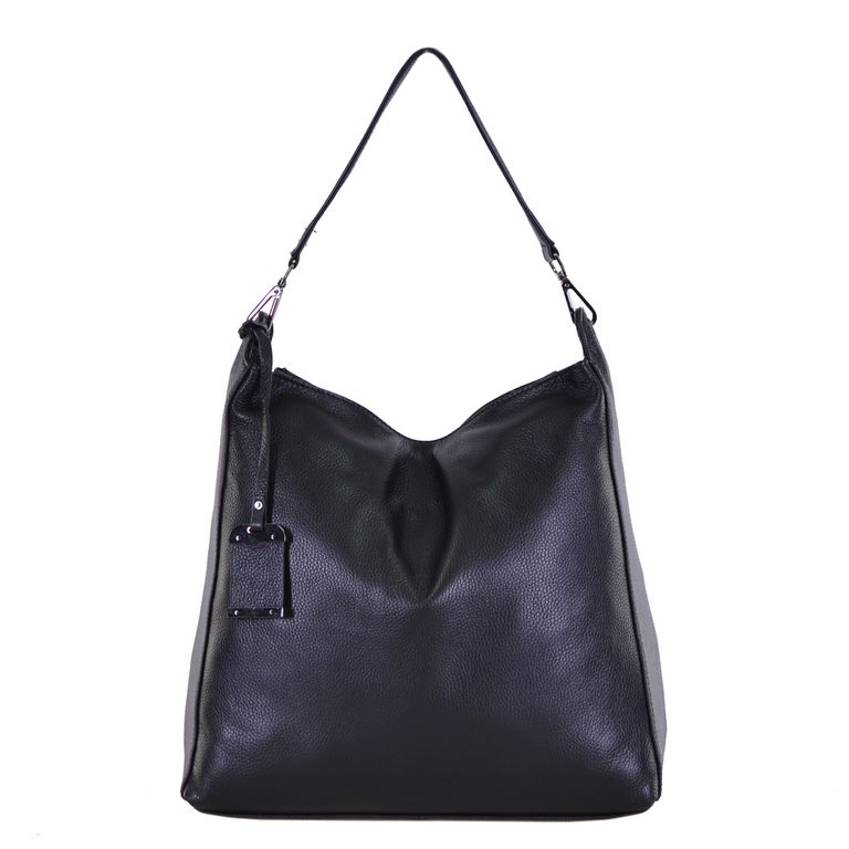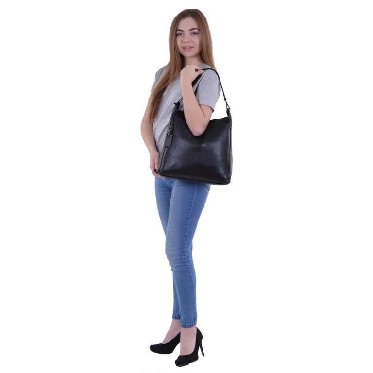 Модель имеет один отдел на молнии и карман на молнии. Внутри подкладочный материал, основное отделение разделено перегородкой с карманом на молнии, на боковых стенках два открытых кармана и карман на молнии. Фурнитура – блестящее серебро. В комплекте плечевой ремень с регулировкой длины и короткий ремешок.